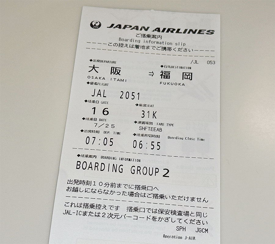 まずは大阪空港から、7:05発 JAL2051便で福岡空港へ飛びます。