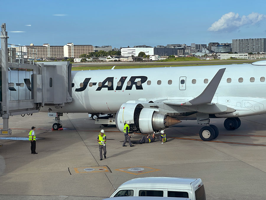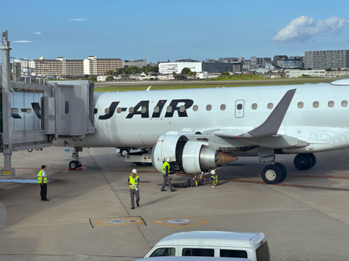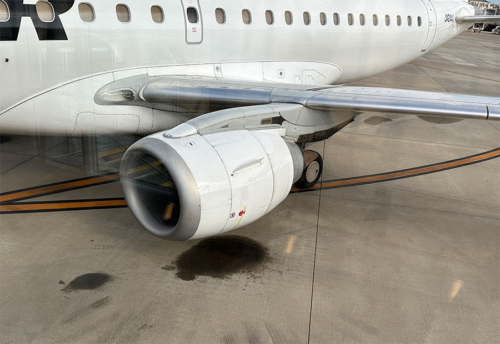 ちょっと不安を抱きつつボーディングブリッジから見ると、エンジンの真下にオイルが漏れたような跡があるじゃないか!