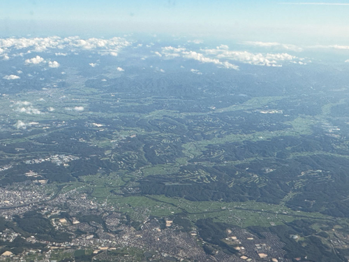 朝日を避けるために進行方向右側に座りましたが、兵庫県にゴルフ場が多いことがよくわかる。