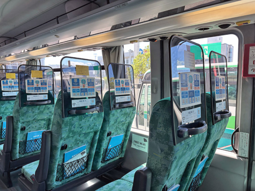 乗り込んでビックリ、シートそれぞれに透明の板が付いてるじゃないか!