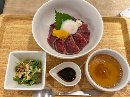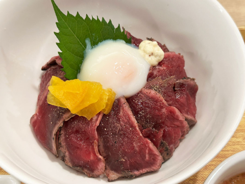 馬肉を軽くあぶったレアステーキ丼で、赤身の旨みを堪能。