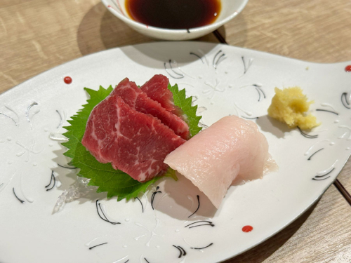 馬肉の赤身とたてがみの刺身、特にたてがみの脂感がたまらない。