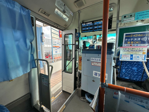 扉付近には運賃箱とカードの読み取り器、液晶の料金表のある路線仕様。