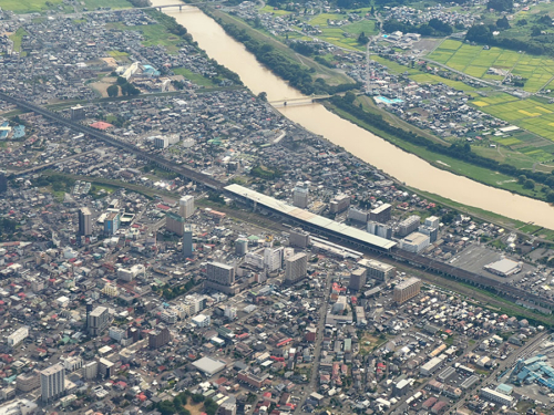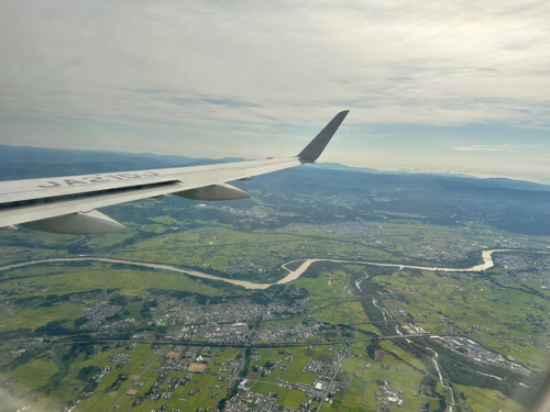 地上を見たりウトウトしてるうちに着陸態勢に入り、北上川に沿って降下。