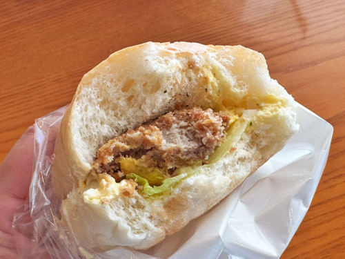 ちょうど朝から何も食べてなかったので、ここで朝食がてら買ったのがたまご&メンチカツサンド。税込480円也。