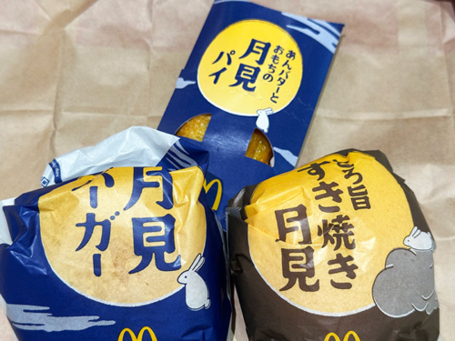 という訳で、今年の月見バーガー(クーポン利用で税込420円也)、とろ旨すき焼き月見(クーポン利用で520円也)とあんバターとおもちの月見パイ(クーポン利用で180円也)を食べてみる。