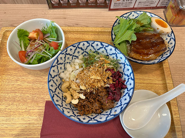 選べるハーフ麺&ハーフ丼のセットメニューで、汁なし担々麺角煮丼をオーダー。税込1,080円也。