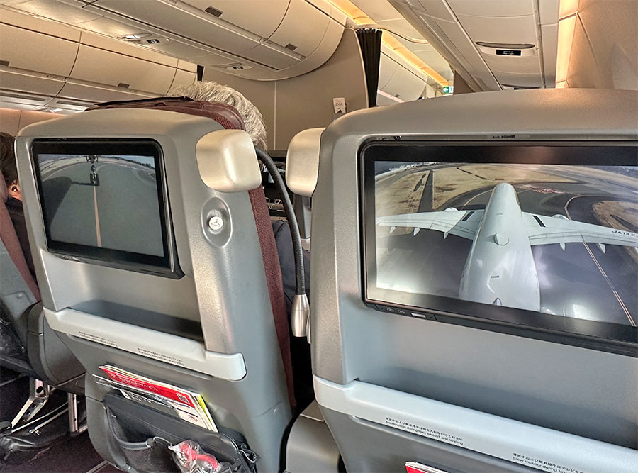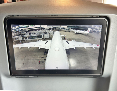 滑走路への移動中、隣席のモニターも使って尾翼と機体下の機外カメラを同時に見て楽しむ。