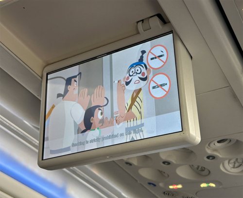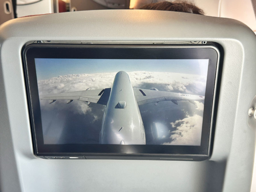 A350は機外カメラが尾翼と機体下の2か所あり、個人用モニターでずっと見られるのが楽しい。