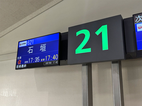 那覇から石垣へは、定刻17:35発JTA621便へ乗り継ぎ。
