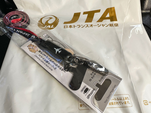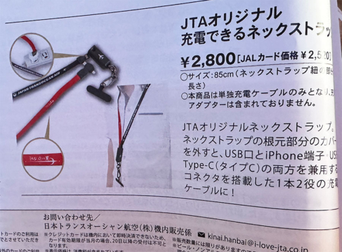 シートポケットの機内販売のカタログを見ていて気になった JTAオリジナル充電できるネックストラップ。