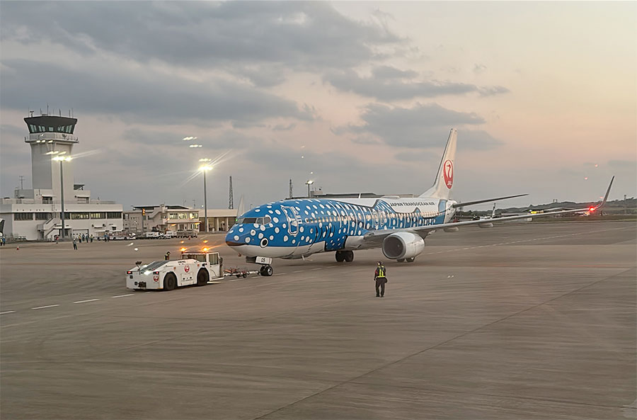 青いジンベエジェットのJA05RKがプッシュバックされてた。