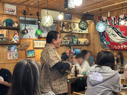 入店すると店内では三線生演奏で歌を歌うライブの真っ最中で、お客さんたちはみんな盛り上がってた。