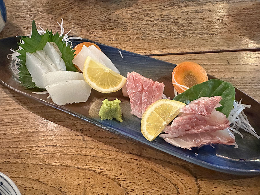 ぷりぷりの歯ごたえがおいしいセーイカ刺身(880円也)と、分厚いアカマチ刺身(880円也)。