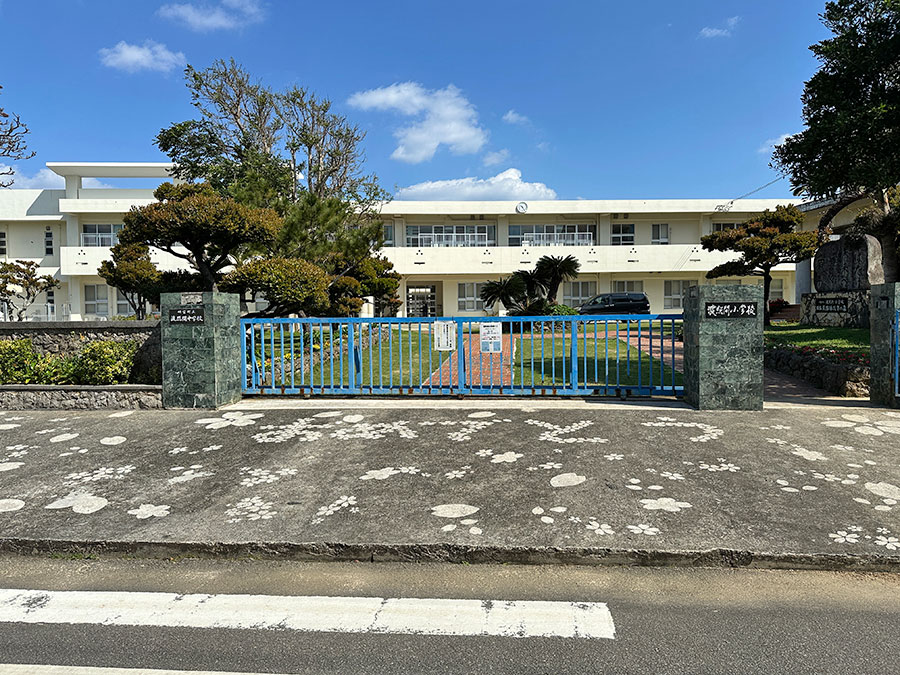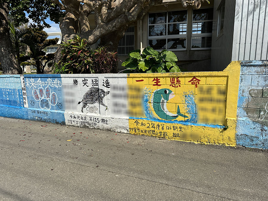 学校のブロック塀には卒業生が描いた絵と名前が書かれてますが、名前を見ると沖縄っぽい名字がいっぱい(写真は一応ボカシてます)。