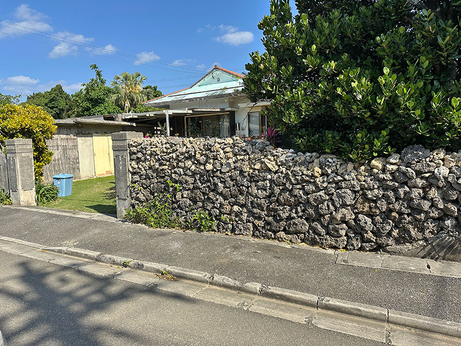 民家の屋根は沖縄でよく見られる赤瓦ですが、垣根は沖縄本島とは違い八重山地方に多いゴツゴツした岩を野面積みした石垣が多い。