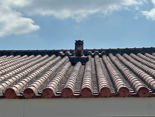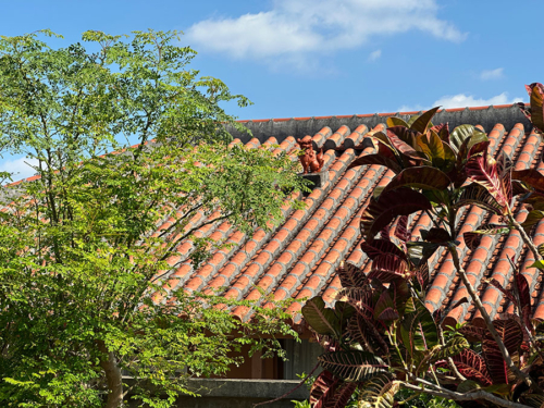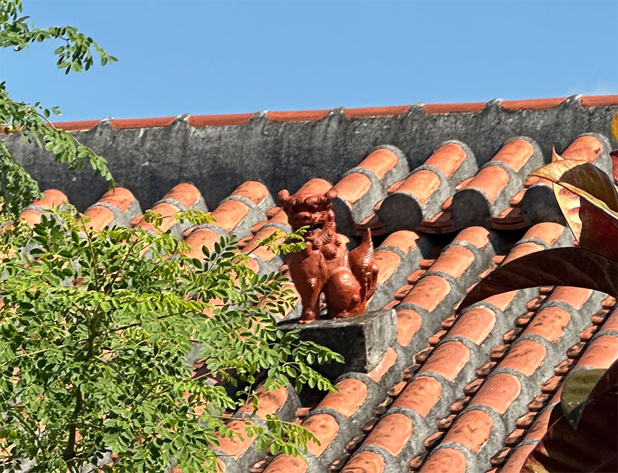 沖縄らしい赤瓦の屋根にシーサーが乗ってますが、太陽の位置によってはシーサーの目が光るらしい。