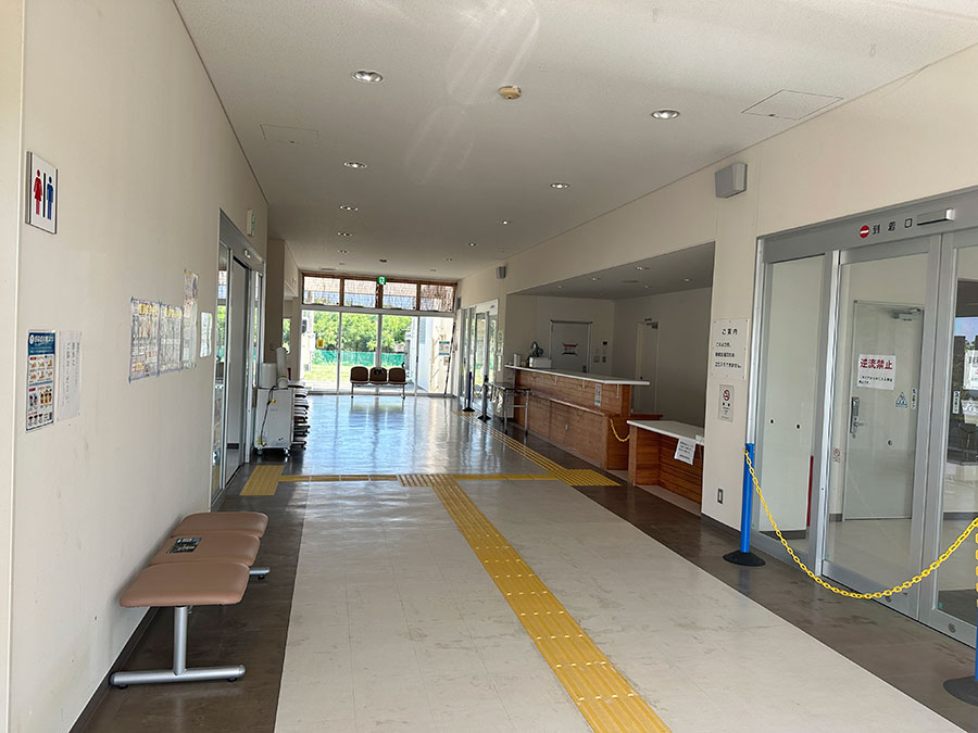 この日は就航日ではなかったのでターミナルは閉まってましたが、入口から中を覗くとカウンターと待合室が見える。