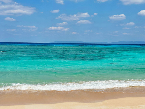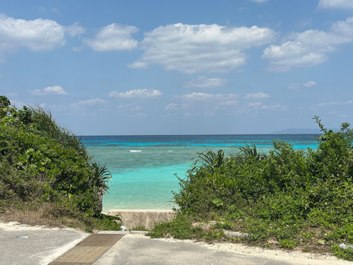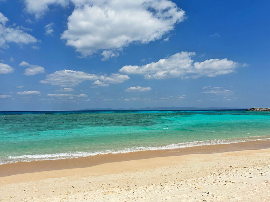 波照間ブルーが美しいニシ浜の眺め。水平線の向こうに見えるのは台湾。