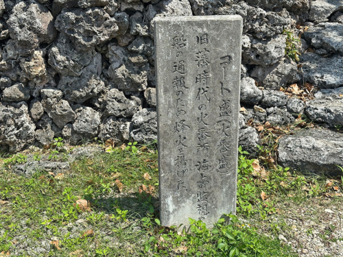 この石碑は、沖縄がまだ日本に返還される前の1970年に当時の大学生が身銭を切って建てたコンクリート製の記念碑。