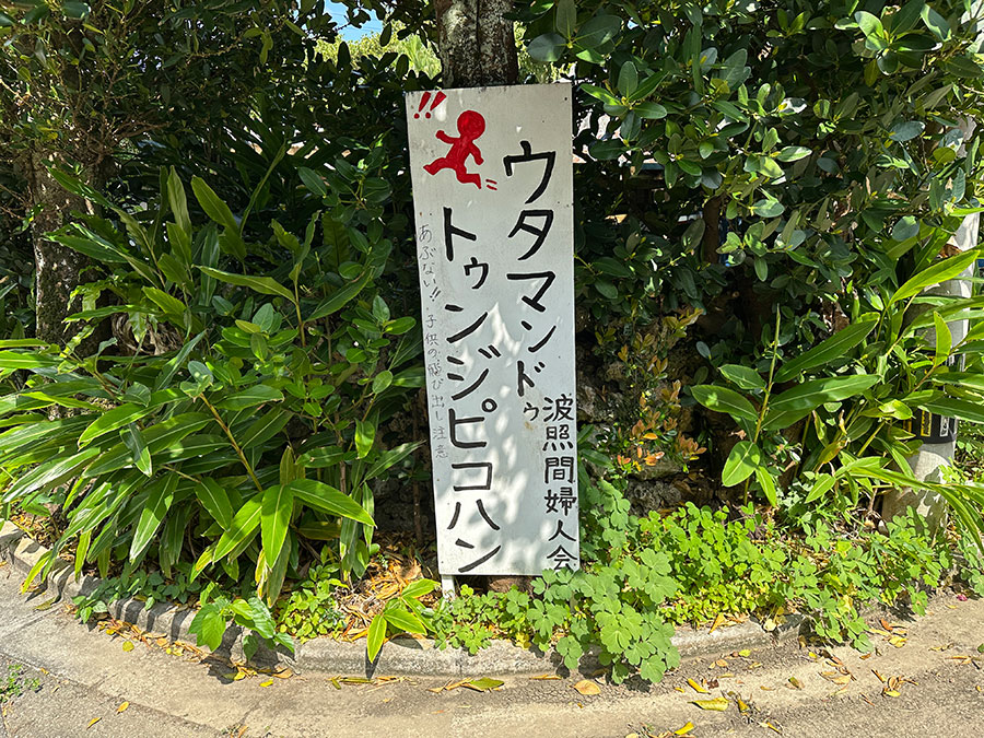 あまりに方言強すぎて伝わらないと察したのか、ウタマンドゥ トゥンジピコハンの看板には小さく「あぶない!! 子供の飛び出し注意」と書いてるし。