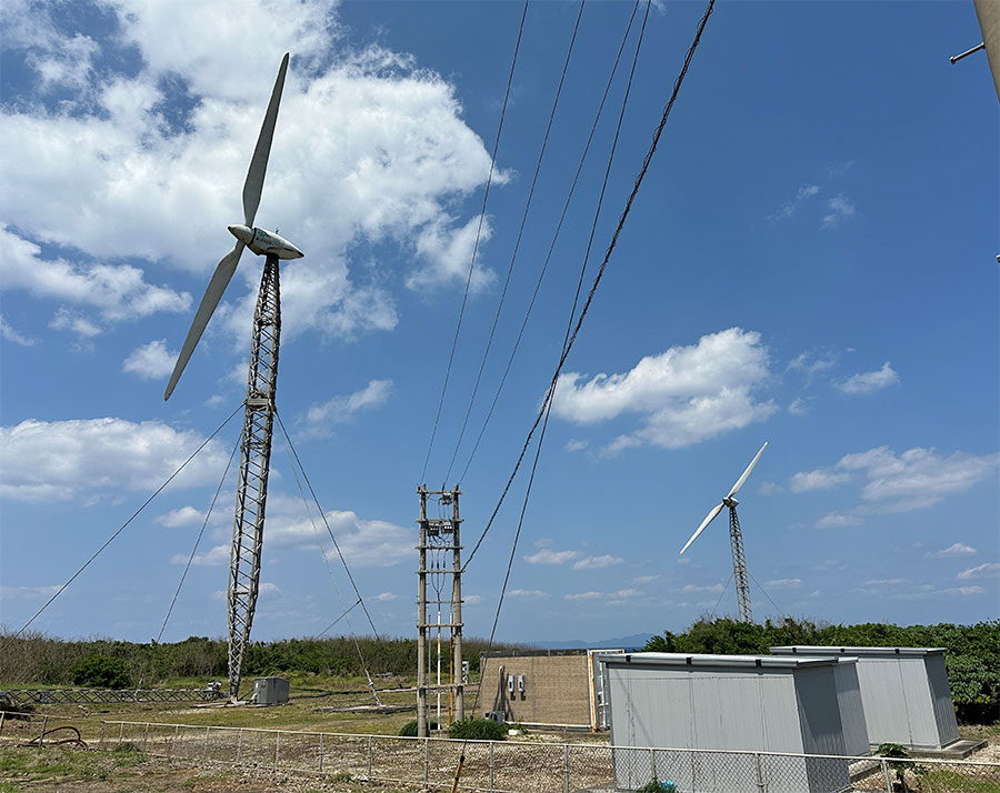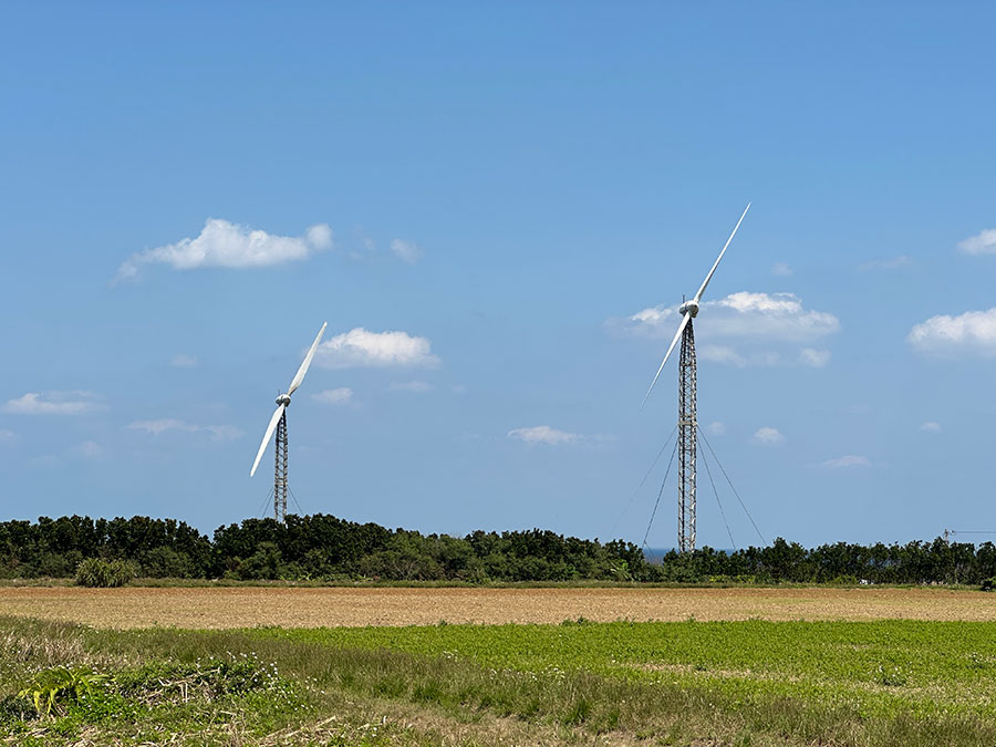 島一周道路へ出て走っていると、畑の向こうに2枚ブレードの風車が2基見えてきた。