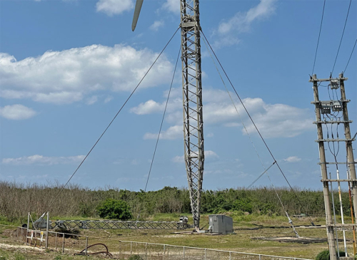 台風が多い波照間島では、普通の風車だと暴風で倒壊してしまう恐れがありますが、この風車は地面に倒せるため台風の被害を受けにくく、かつ、この風車は360度どの方向からの風でも受けることができるため効率の良い発電ができるという。