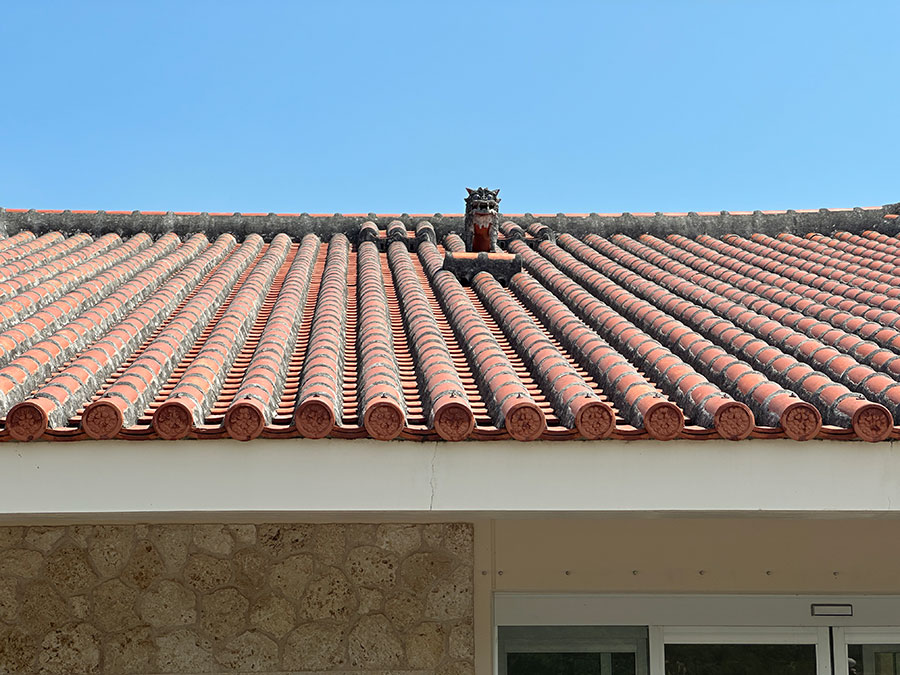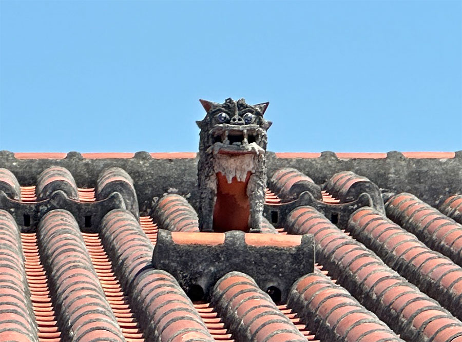 屋根にシーサーが乗っていて、太陽の向きによっては目が光るとツアーガイドさんの解説でしたが、午前中、シーサーの目は光ってませんでした。