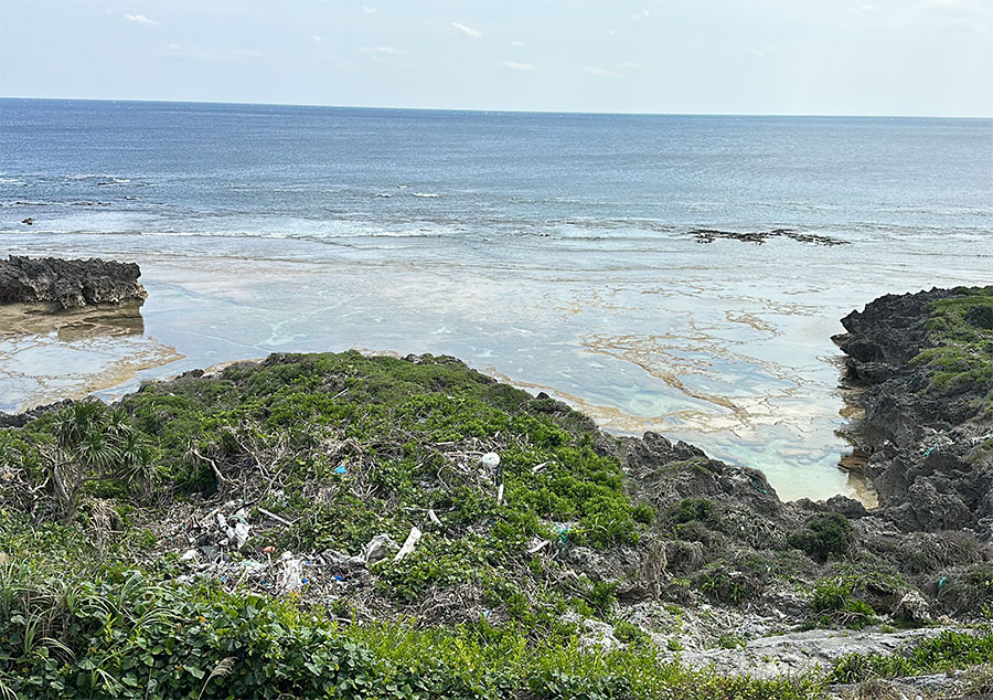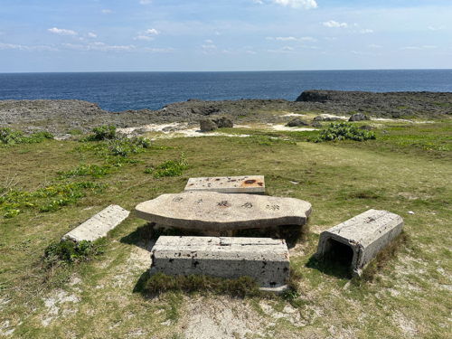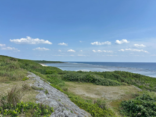 日本最南端の碑から少し西へ行ったところの小高い場所から東を見ると、砂浜の向こうに海へせり出している場所がありますが、本当の島の最南端はあのあたり。