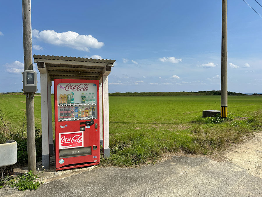 畑の中にポツンと自販機がありますが、おそらく民間人が使える日本最南端の自販機。