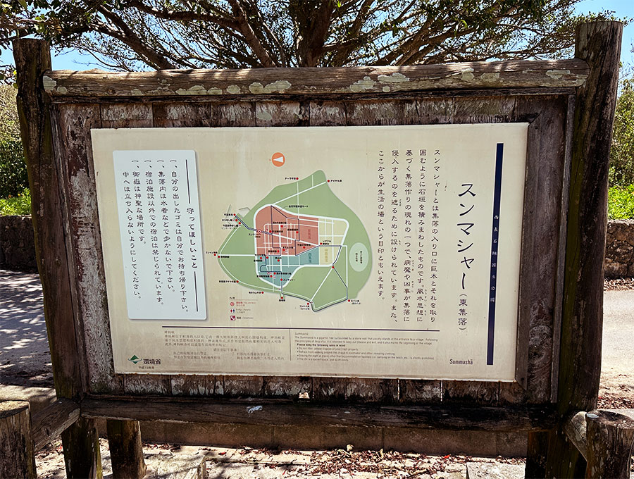 坂の上の集落の入口にはガジュマルの大木の周囲に石垣を積んだ「スンマシャー」と呼ばれる広場が設けられており、集落に入る上での順守事項も書かれている。