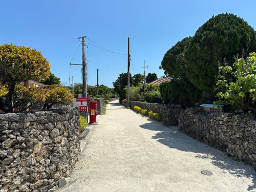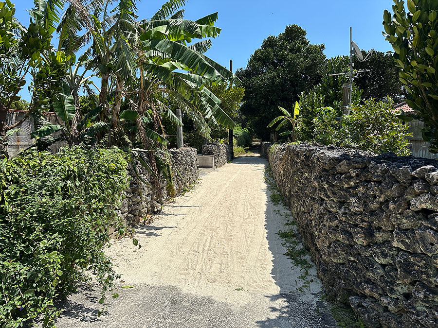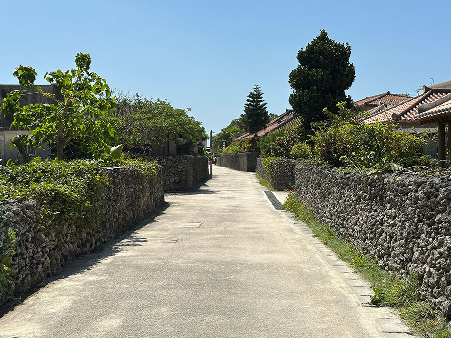 集落は、道の両側にサンゴ石灰岩の野面積み石垣で囲われた民家が整然と並ぶ。