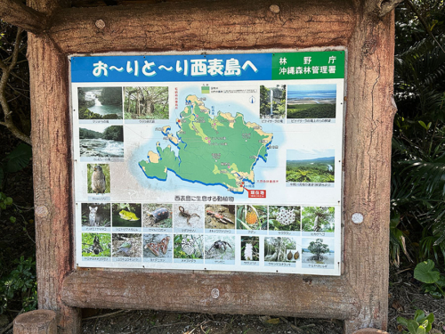 港から少し高台にある大原集落へ坂を上がって行く道中に、「お~りと~り西表島へ」(八重山方言で「ようこそ西表島へ」)と書かれた島の案内図が。