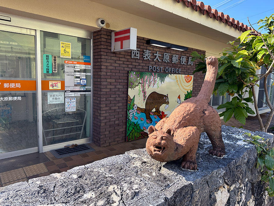竹富島の郵便局には赤瓦にシーサーがいましたが、西表島の郵便局には屋根にシーサーはおらず入口付近にイリオモテヤマネコっぽいものがある。