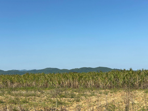 集落を抜けるとサトウキビ畑が延々と広がり、収穫作業をしてる人の姿も。