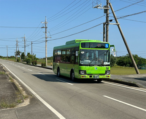 豊原バス停から大原港へ戻るために来た道を引き返していると、後ろからさっき見た黄緑色のバスに抜かれてしまう。