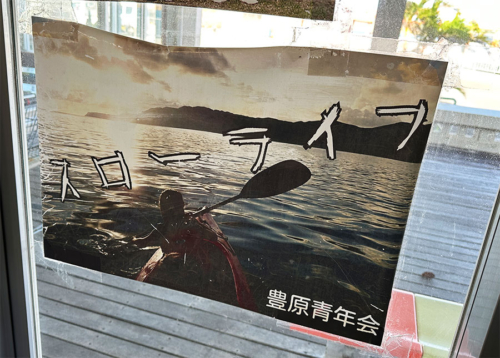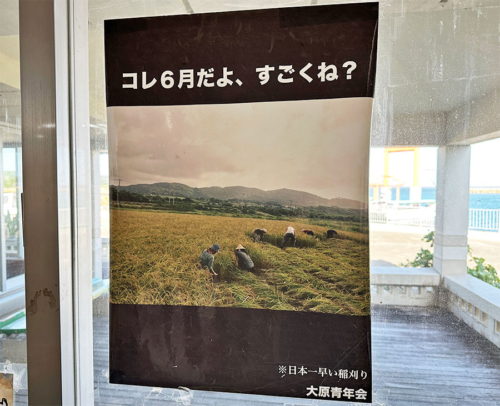 ガラスに貼ってあったポスター、コレ6月だよ、すごくね?と書いてあるので何がすごいのかとよく見ると、どうも稲刈りしてる写真で「日本一早い稲刈り」と解説されてる。
