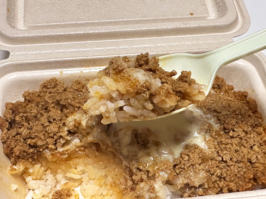 ごはんがたっぷりなのでレンジで温めるのは意外と時間が掛かり、600Wで3分10秒ぐらいでちょうどよく、3分30秒ではちょっと温めすぎかな。