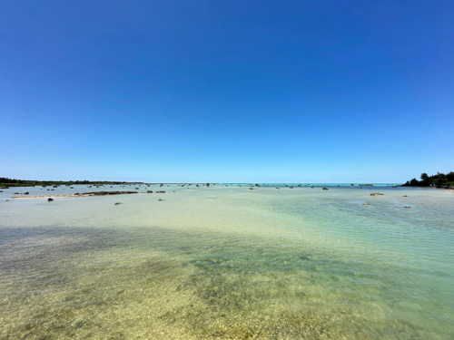 橋から海の方を見ると、遠浅の海に岩が点々としてたり。