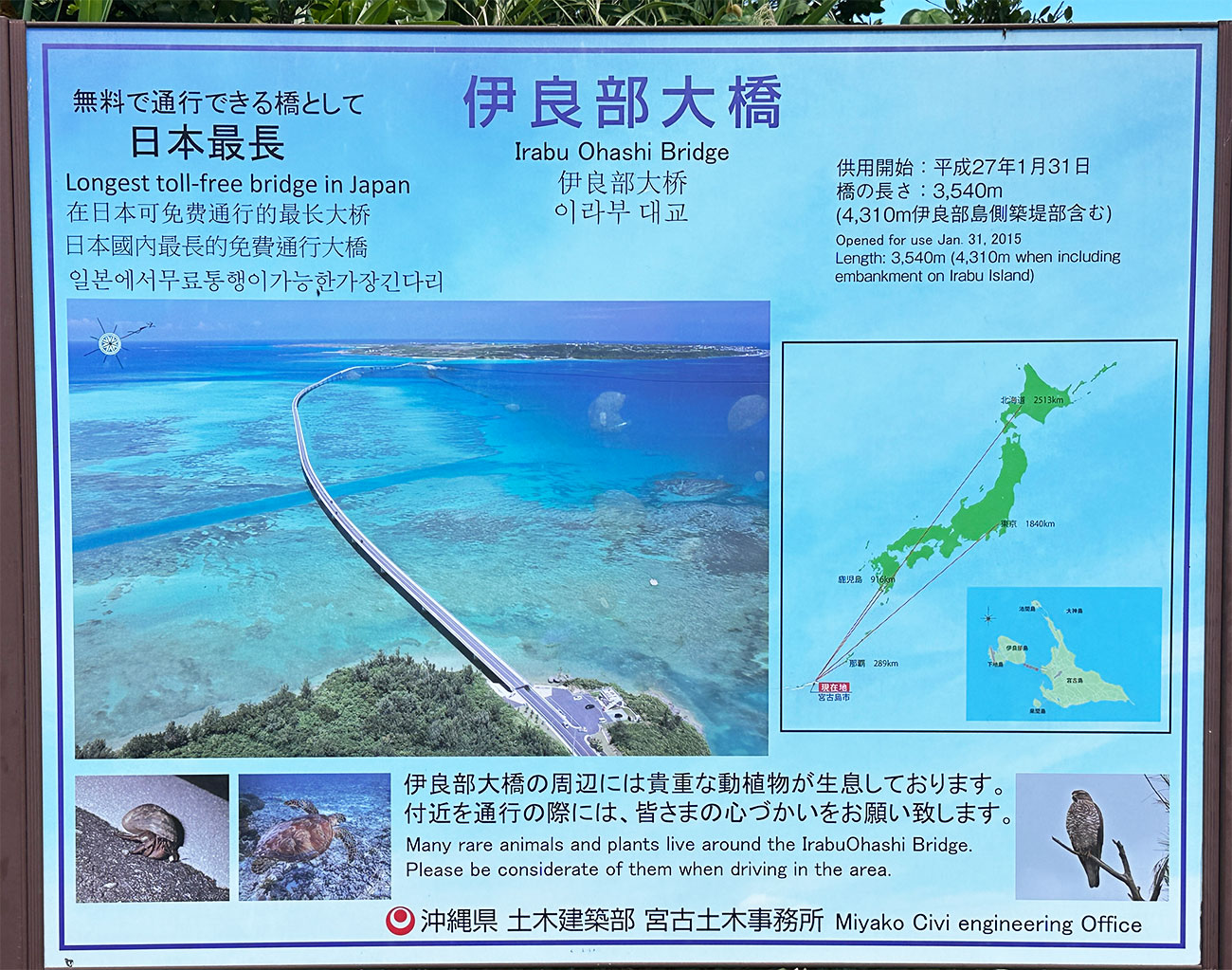 全長3540mの伊良部大橋は無料で通行できる橋では日本最長で、有料の道路橋を含めても日本で4番目の長さなんだとか。