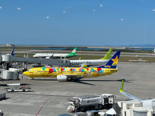 スマホでオーダーして待ってる間に外を見ると、スポットにはスカイマークのピカチュウジェットBC1(JA73AB)が。
