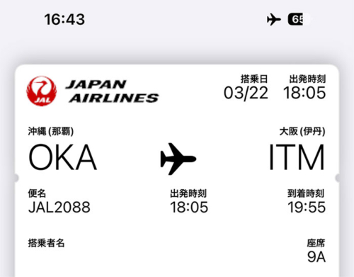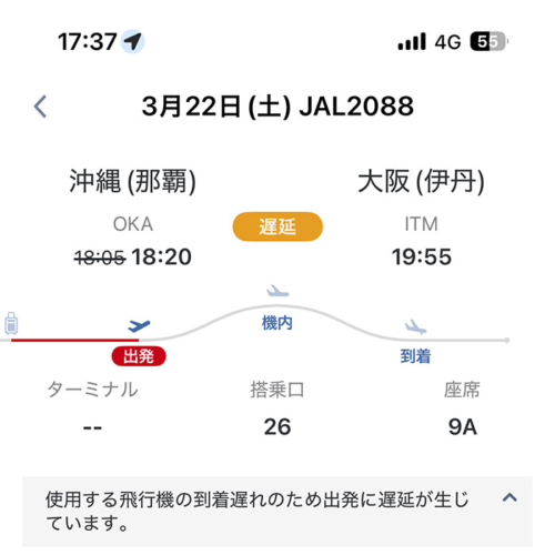 那覇18:05発 JAL2088便に乗りますが、16:43分現在遅れ表示は出ておらず定刻で案内されてます。