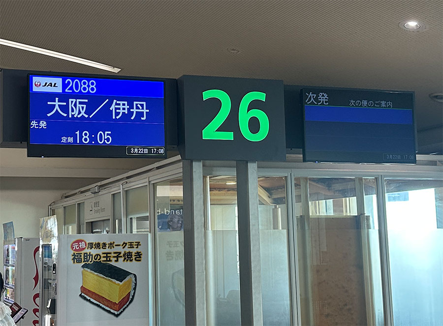 宮古空港から那覇に到着後、外へは出ずに保安区域内のサクララウンジで待つことにしたので、一応、搭乗口だけ確認しておく。