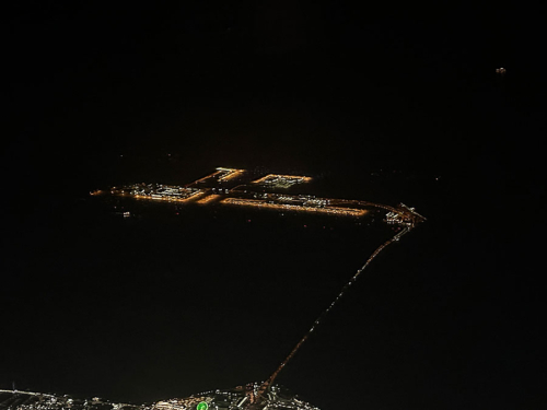 大阪空港への着陸態勢に入り、眼下には関空と連絡橋が見えてくる。