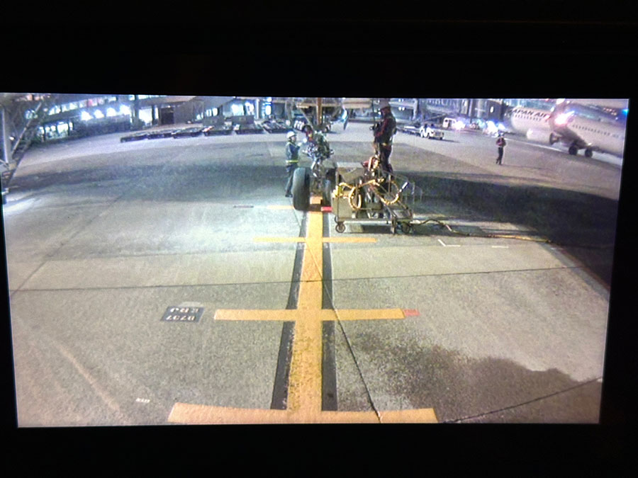 A350-900は地上でも個人用モニターで機外カメラの映像を見ることができるので、スポットインしてからの作業の様子も見られます。
