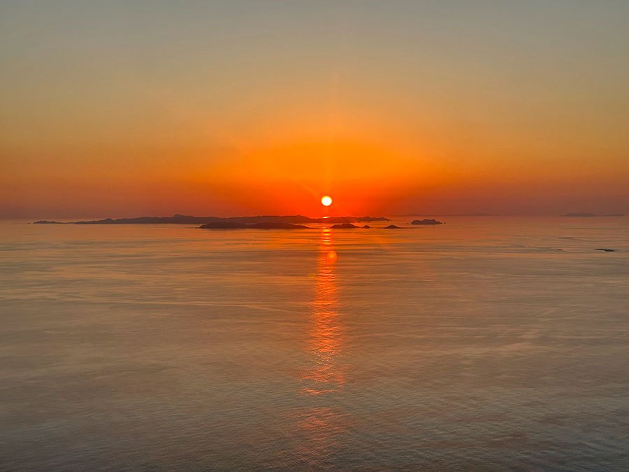 那覇空港を離陸した旅客機はしばらくの間高度の低いところを飛行しますが、もう真っ赤な太陽が沈みかける時間。