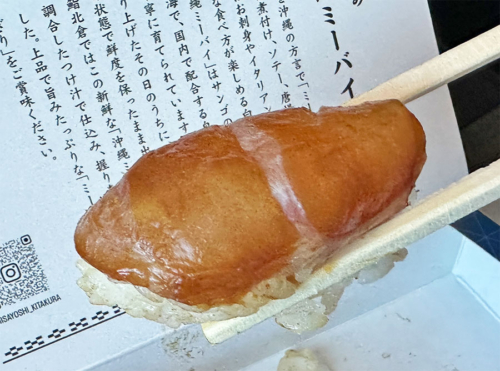 沖縄ミーバイを島とうがらしを効かせた漬けにしたにぎり寿司。