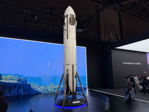 今やホンダはロケットを飛ばそうとしており、今年6月に高度271mまで垂直に打ち上げられたあと垂直姿勢を保ったまま決められた位置に着陸した再使用型ロケットも展示。