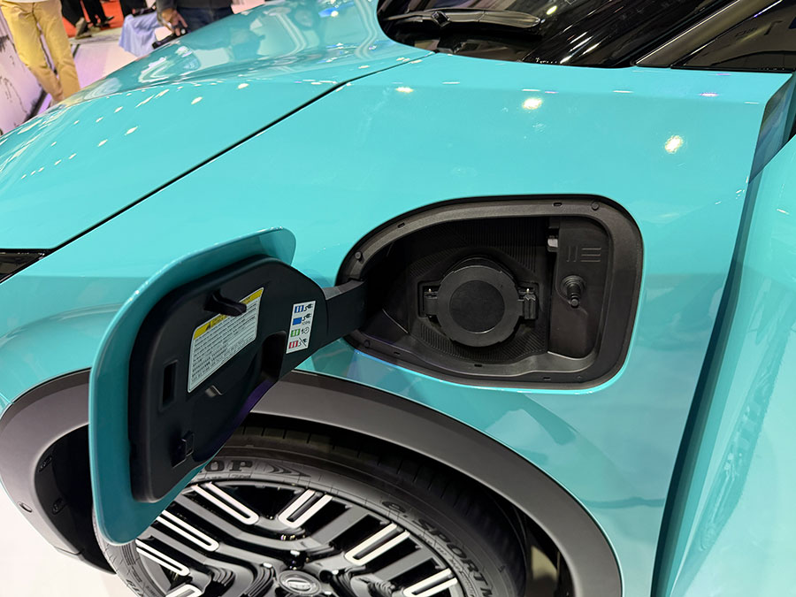リーフは代々充電口はボンネットの先にありましたが、新型ではアリアと同じ左Aピラー下に。