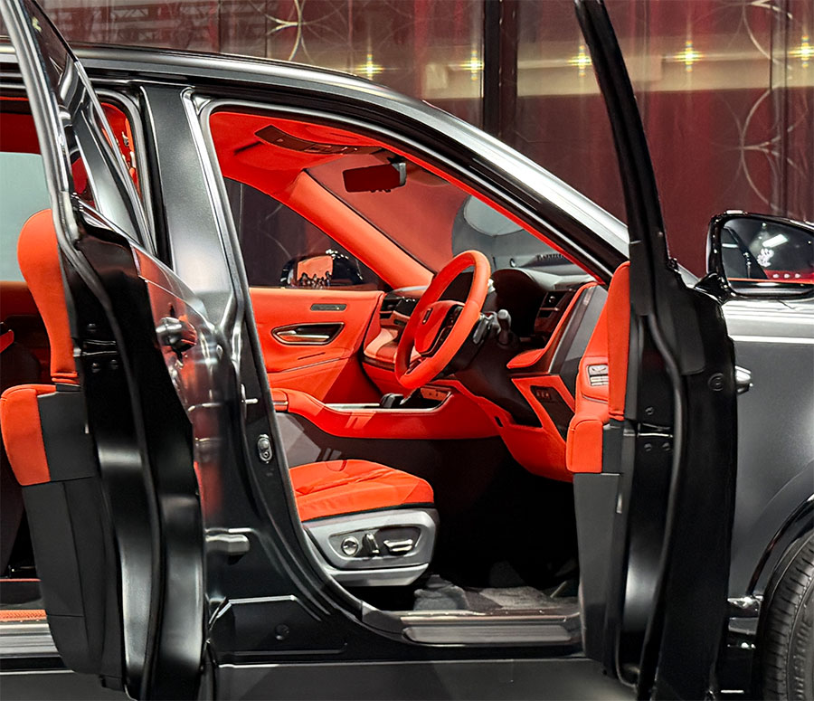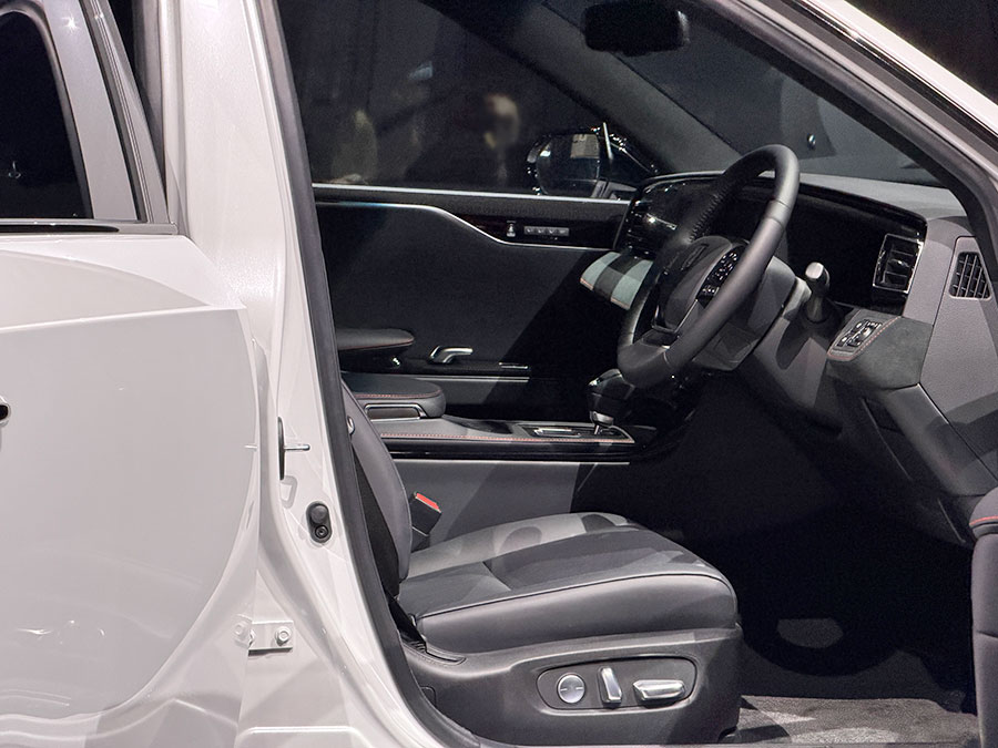 ドライバーズカーとなったセンチュリーの運転席は木目パネルがカーボンになり、ステッチが入ったりスエード生地が使われてたりと走りの雰囲気に。
